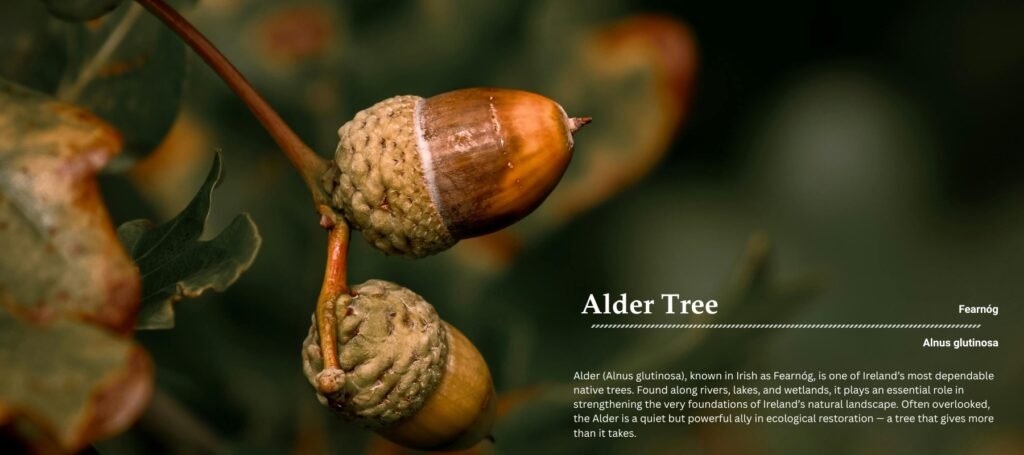 Yes, the Alder is a native Irish tree species, naturally occurring across riverbanks, wet woodlands, and low-lying areas. It is perfectly adapted to Ireland’s damp climate and soft soils. Unlike most trees that struggle in waterlogged ground, Alder thrives in wet conditions, forming part of the natural woodland mix that once covered much of the country’s riparian zones.