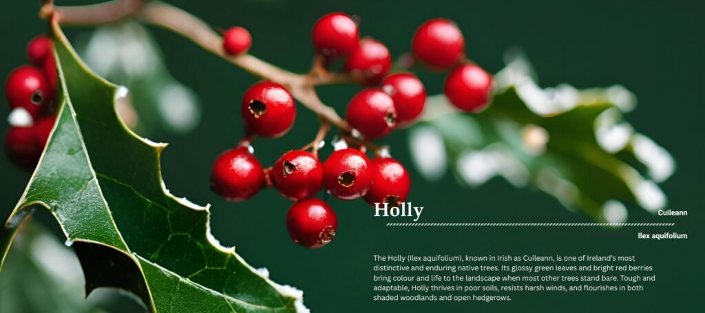 Few trees hold such deep cultural meaning in Ireland as Holly. In ancient times, it was seen as a tree of protection, believed to guard against lightning, evil spirits, and misfortune. Many homes planted Holly nearby as a natural talisman of safety and luck.