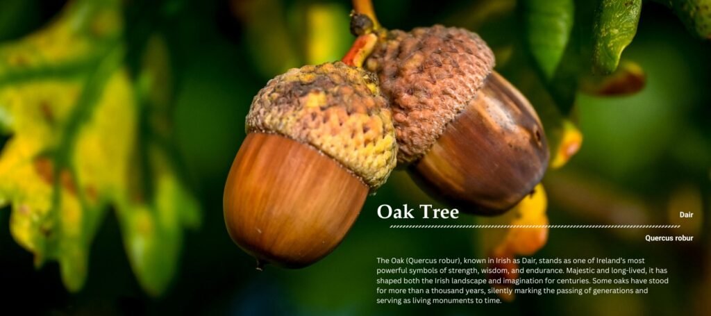 In Irish tradition, oak has always been a sacred and respected tree. It was revered by the druids, who held their ceremonies in oak groves, and its name appears in countless Irish place names, from Derry (Doire) to Kildare (Cill Dara, the Church of the Oak).