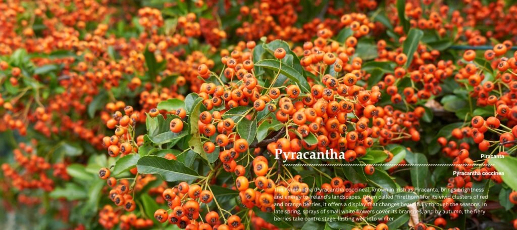 While Pyracantha does not feature in traditional Irish mythology, it carries symbolic associations of protection and good fortune across Europe. The plant’s thorny branches were once thought to ward off negative energy and safeguard homes. In modern times, this idea has evolved into a more practical truth: Pyracantha protects in its own way, offering shelter, food, and life to the creatures that depend on it.